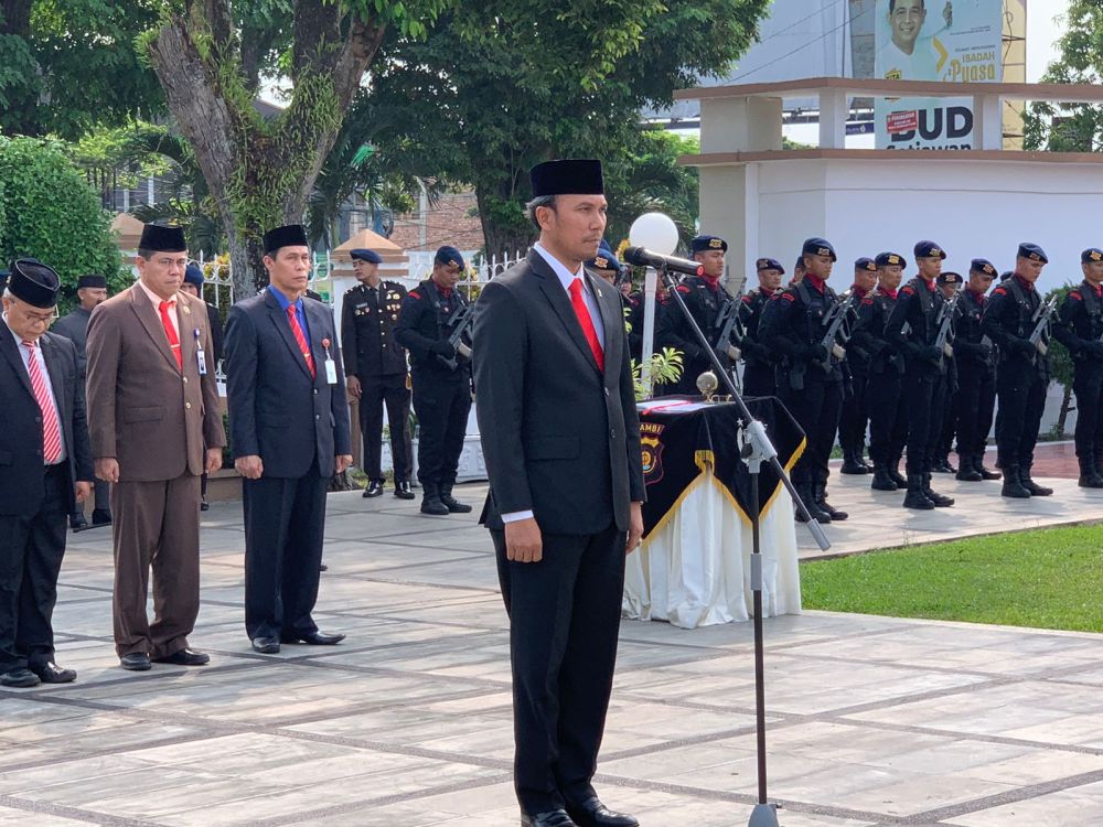 JAMBI - Ketua DPRD Provinsi Jambi, Edi Purwanto menghadiri upacara peringatan Hari Pahlawan di halaman kantor Gubernur Jambi, Jumat (10/11). Upacara ini dihadiri Sekretaris Daerah, Sudriman, Danrem 042/Gapu, Brigjen TNI Supriono, dan sejumlah unsur forkompimda di lingkup pemerintahan Provinsi Jambi, termasuk veteran Jambi.