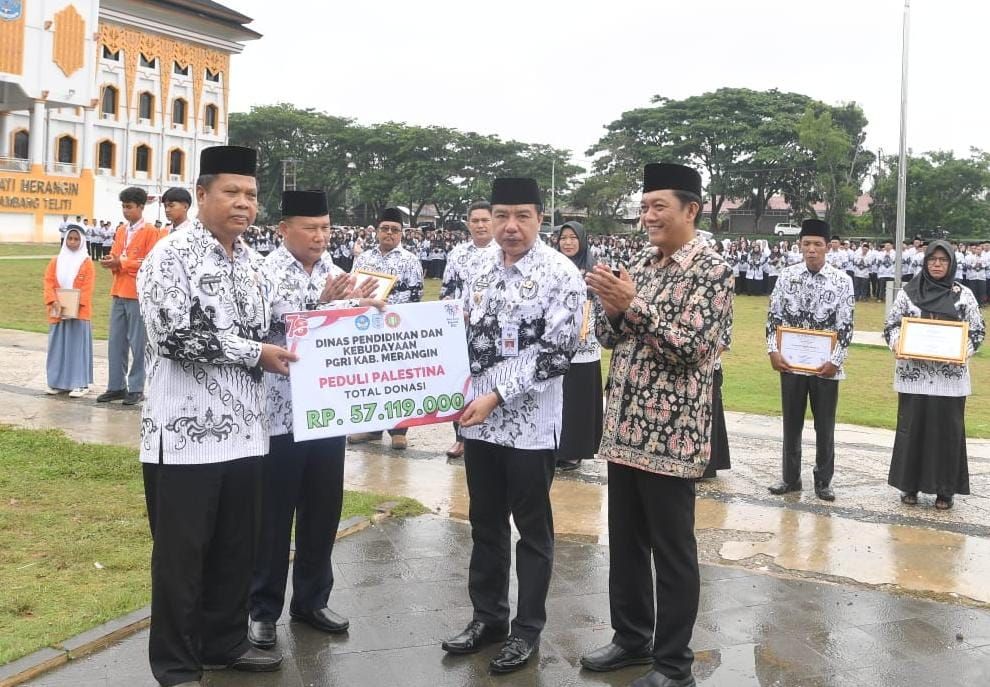 Batangharinews.com, Bangko - Masih banyak guru yang bertugas di Kabupaten Merangin berstatus honorer, untuk itu kesejahteraannya dan statusnya harus diperhatikan, sehingga kehidupannya lebih sejahtera. Hal tersebut sebagaimana disampaikan Pj Bupati Merangin H Mukti pada upacara Hari Ulang Tahun (HUT) ke-78 Persatuan Guru Republik Indonesia (PGRI) dan Hari Guru Nasional (HGN) Tahun 2023, di halaman depan Kantor Bupati Merangin, Sabtu (25/11/23). ‘’Guru adalah pahlawan tanpa tanda jasa yang telah banyak melahirkan orang-orang hebat. Profesi guru sangat mulia untuk itu kesejahteraannya sedikit demi sedikit harus ditingkatkan,’’ ujar Pj Bupati Merangin. Pada upacara yang diikuti ribuan guru se-Kabupaten Merangin tersebut, pada amanatnya Pj bupati membacakan sambutan Ketua umum pengurus besar PGRI Prof Unifah Rosyidi. Hadir Sekda Merangin Fajarman, Ketua PGRI Merangin H Zubir dan Kadiknas H Abdul Gani. Dikatakan H Mukti, PGRI sebagai organisasi profesi guru, pendidik dan tenaga kependidikan, telah tumbuh menjadi kekuatan moral intelektual dalam memperjuangkan peningkatan harkat martabat anggotanya. ‘’PGRI harus mengedepankan sikap inklusif, dialogis, dengan memegang teguh etika, saling menghormati dalam spirit organisasi yang mandiri, unitaristik dan non partisan,’’ terang Pj Bupati Merangin. H Mukti mengingatkan kepada seluruh guru yang bertugas di berbagai pelosok pedesaan terlebih yang bertugas dalam kota Kabupaten Merangin, agar selalu menjalankan tugasnya dengan baik dimanapun bertugas. Ingat terus semboyan Tut Wuri Handayani yang bermakna seorang guru adalah pendidik yang terus-menerus menuntun, menopang dan menunjuk arah yang benar bagi hidup dan karya anak-anak didiknya. Tut wuri artinya “di belakang” atau “mengikuti dari belakang” dan handayani yang berarti “memberikan semangat”. Pada kesempatan itu, Pj bupati memberikan penghargaan kepada para guru-guru berprestasi, baik di tingkat Provinsi Jambi maupun di tingkat nasional dari berbagai kecamatan dalam Kabupaten Merangin. Pada HUT ke-78 PGRI dan HGN tahun 2023, para guru-guru Kabupaten Merangin juga menyalurkan dana PGRI Perduli Palestina, yang nilai total dana yang berhasil dikumpulkan memcapai Rp 57.119.000,-.