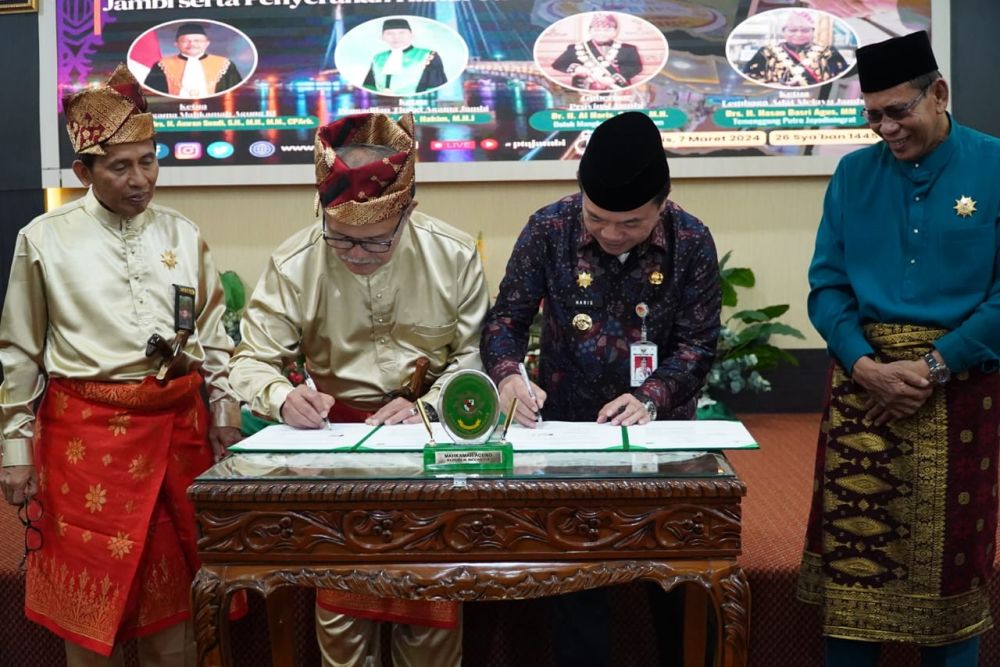 JAMBI - Gubernur Jambi, Dr. H. Al Haris, S.Sos. MH mengemukakan, peran lembaga adat sangatlah strategis dan sangat dinantikan oleh masyarakat dalam upaya mempertahankan nilai-nilai luhur masyarakat, dalam memainkan perannya lembaga adat berdiri diatas aturan dan norma- norma yang berlaku dan berkembang dalam masyarakat dan pada gilirannya menuntut ketaatan bagi masyarakat mencari keadilan perdamaian di masyarakat. Hal tersebut dikemukakan Gubernur saat Penandatanganan Memorandum of Understanding (MoU) Pengadilan Tinggi Agama Jambi dengan Lembaga Adat Melayu Jambi sekaligus Pemberian Anggota Kehormatan Adat Lembaga Adat Melayu (LAM) Provinsi Jambi kepada  Dr. Drs. H. Amran Suadi, S.H., M.H., M.Hum selaku Ketua Kamar Agama Mahkamah Agung RI dan Dr. Abd. Hakim, M.H.I selaku Ketua Pengadilan Tinggi Agama Jambi, serta penyerahan hibah tanah milik Pemerintah Provinsi Jambi kepada Pengadilan Tinggi Agama Jambi oleh Gubernur Jambi, bertempat di Aula I Pengadilan Tinggi Agama Jambi, Kota Baru Jambi, Kamis (07/03/2024).