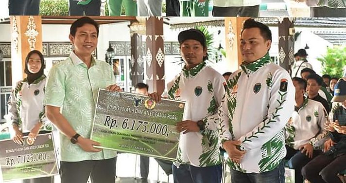 MUARABULIAN - Bupati Batanghari, Muhammad Mhd Fadhil Arief, SE secara simbolis menyerahkan bonus alet, pelatih dan asisten pelatih Kabupaten Batanghari peraih mendali pada Pekan Olahraga Provinsi Jambi ke- XXIII tahun 2023.