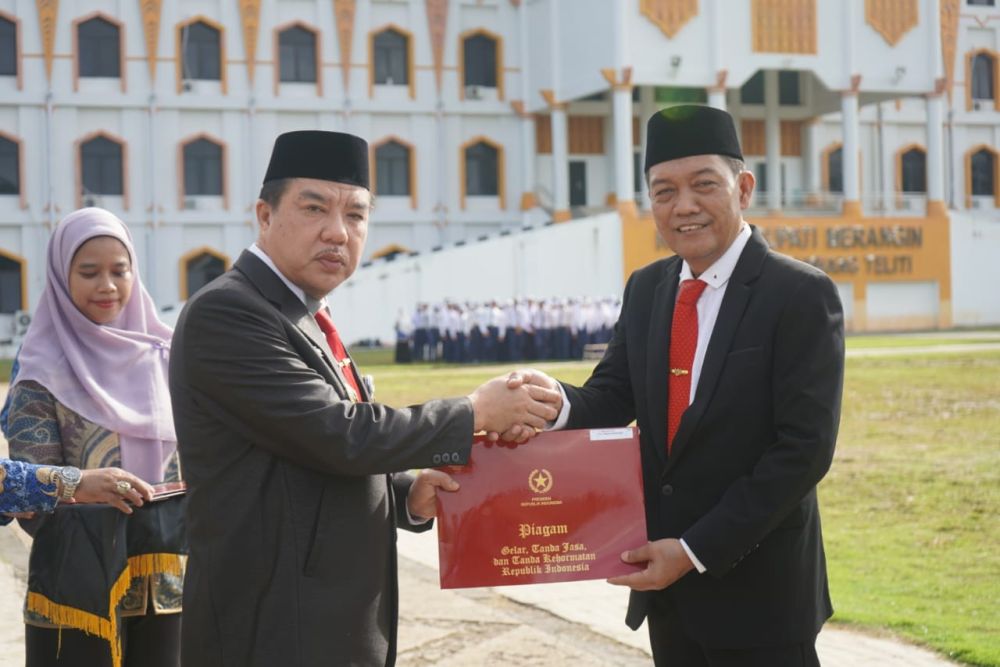 MERANGIN - Pemerintah Kabupaten Merangin memperingati hari Pendidikan Nasional 2024, yang dipusatkan pada upacara akbar di pelataran Kantor Bupati Merangin, Kamis (02/5/24). Tampil sebagai Inspektur Upacara Pj Bupati Merangin H Mukti. Pada amanatnya H Mukti membacakan pidato Menteri Pendidikan, Kebudayaan, Riset dan Teknologi Republik Indonesia Nadiem Anwar Makarim. ‘’Jadi pada hari pendidikan kali ini Pak Menteri menekankan pentingnya Merdeka belajar. Kedepan Mardeka belajar bagi anak dan mahasiswa akan tercapai dengan sebaik-baiknya,’’ujar Pj Bupati. Anak-anak dan para mahasiswa terang H Mukti, bebas dalam belajar tidak ada ancaman, tidak ada tekanan dalam belajar. Untuk itu kenyamanan belajar harus didukung dengan infrastruktur pendidikan yang bagus dan lengkap. ‘’Pemkab Merangin terutama Dinas Pendidikan dan Kebudayaan Kabupaten Merangin, akan terus berupaya memberikan rasa nyaman, aman dan bahagian kepada para pendidik dan anak-anak yang dididiknya,’’terang Pj Bupati. Pada upacara hari Pendidikan Nasional tersebut, Pj bupati menganugerahkan tanda kehormatan Satya Lencana Karya Satya kepada, Sekda Merangin Fajarman yang telah mengabdi sebagai pegawai selama 30 tahun. Selain itu Satya Lencana Karya Satya juga diberikan kepada Kadis DPKAD Merangin Masyhuri yang telah mengabdi sebagai pegawai selama 20 tahun dan salah seorang pegawai Syahputra yang telah mengabdi selama 10 tahun.