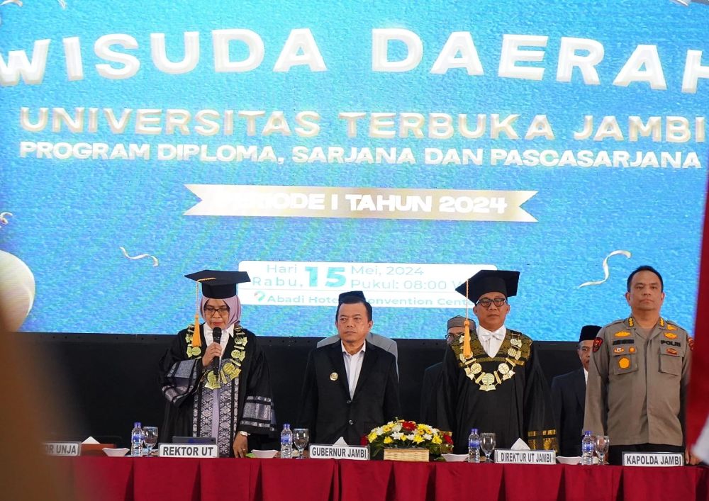 JAMBI - Gubernur Jambi Dr. H. Al Haris, S.Sos, MH menyampaikan ucapan terima kasih dan penghargaan yang tinggi kepada Universitas Terbuka (UT) Jambi atas peran serta dan kontribusinya dalam meningkatkan kualitas Sumber Daya Manusia (SDM). Sebagai pelopor pendidikan jarak jauh, UT berupaya agar pendidikan tinggi bisa dinikmati secara merata, tanpa terhalang jarak dan inilah yang dicetuskan atau konsep Merdeka Belajar sudah ada dari UT. Hal tersebut disampaikan Gubernur saat menghadiri Wisuda Daerah Universitas Terbuka (UT) Jambi Program Diploma, Sarjana dan Pascasarjana Lulusan Periode I Tahun Akademik 2023/2024, bertempat di Gedung Abadi Convention Center, Kota Jambi, Rabu, (15/05/2024) pagi.