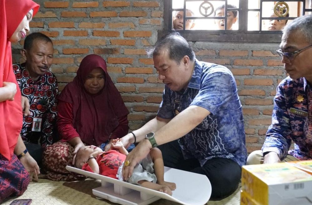 Merangin-Usai membuka rakor monitoring dan evaluasi (Monev) kinerja Tim Percepatan Penurunan Stuntung (TPPS) Kabupaten Merangin 2024 di Aula Kantor Camat Tabir, Pj Bupati Merangin H Mukti langsung mengunjungi balita Stunting. Pada kunjungan ke rumah balita Stanting tersebut, Pj bupati sempat ikut menimbang dan mengukur tinggi balita berusaia 2,3 tahun itu. ‘’Ini lumayan bagus pertumbuhannya, tolong terus lakukan perawatan, sehingga anak ini bisa bebas Stunting,’’ujar Pj Bupati. Pj bupati melakukan Pemberian Makanan Tambahan (PMT) kepada balita itu berupa telur dan susu. Diharapkan Pj bupati dalam waktu dekat, anak tersebut akan terbebas dari Stunting karena pertumbuhannya dari minggu ke minggu cukup baik. Diakui H Mukti ada sebanyak 15 kasus anak Stunting di Kecamatan Tabir, secara bertahap angka akan terus ditekan, sehingga ditargetkan dalam waktu beberapa bulan kedepan akan tuntas Stunting di Kematan Tabir tersebut. ‘’Kami secara rutin akan terus melakukan Pemberian Makanan Tambahan (PMT) kepada 15 balita Stunting di Tabir ini, sehingga pertumbuah badan dan otaknya secara lambat laun akan membaik dan menjadi anak yang normal,’’terang H Mukti. Tampak hadir mendampingi Pj bupati saat menjenguk anak Stunting itu, Kadis PPKB H Abdaie, Kadis Perikanan Irsadi, Sekdin Kesehatan Merangin Mas’ud, Hj Hasbiyah dari TP PKK Kabupaten Merangin, Camat Tabir Samsil Zaini dan Kapus Rantau Panjang dr Ayu Hastuti. Pada kesempatan itu, Pj bupati mengajak seluruh lapisan masyarakat mampu, untuk ikut berperan dalam percepatan penurunan angka Stunting di Kabupaten Merangin, dengan menjadi Bapak Asuh Anak Stunting (BAAS).