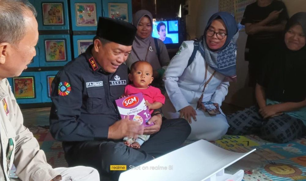 Di rumah Ny Yutri, Sekda juga langsung menggendong anak Stunting yang bernama Asira. Balita berumur sembilan bulan itu, badannya sangat kecil dibandingkan usianya. Artinya ada masalah dengan pertumbuhan anak tersebut.