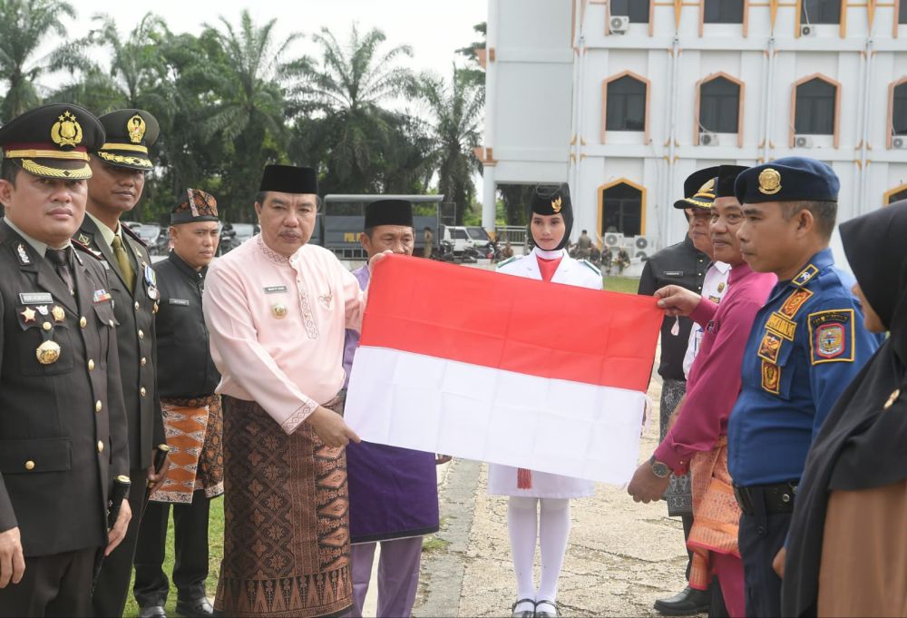 Merangin-Pemerintah Kabupaten Merangin memperingati hari lahir Pancasila tahun 2024. Peringatah hari lahir Pancasila itu difokuskan pada upacara pengibaran Bendera Merah Putih di halaman depan kantor bupati Merangin, Sabtu (01/6/24). Bertindak sebagai Inspektur Upacara Pj Bupati Merangin H Mukti. Pada pengarahannya H Mukti membacakan pidato Kepala Badan Pembinaan Ideologi Pancasila Republik Indonesia Yudian Wahyudi. ‘’Saya mengajak komponen bangsa untuk bahu membahu membumikan nilai-nilai Pancasila ke dalam setiap aspek kehidupan bermasyarakat, berbangsa dan bernegara,’’ujar Pj Bupati. Sebagai meja statis jelas H Mukti, Pancasila terbukti mampu mempersatukan masyarakat dalam menghadapi berbagai gelombang tantangan dan ujian sejarah, sehingga sampai dengan saat ini Indonesia tetap berdiri kokoh dan tangguh sebagai bangsa yang besar. Sedangkan sebagai Leitstar dinamis lanjut Pj bupati, Pancasila merupakan Bintang penuntun yang mambawa Indonesia pada gerbang kemajuan dan kemakmuran di era globalisasi teknologi dan informasi sekarang ini. ‘’Pancasila harus senantiasa kita jiwai dan pedomani agar menjadi ideologi yang bekerja, yang dirasakan kehadiran dan manfaatnya oleh seluruh masyarakat Indonesia,’’tegas Pj Bupati. Selain regulasi yang berlandaskan pada semangat dan jiwa Pancasila tutur H Mukti, semua juga perlu keteladanan yang tercermin dari etika, integritas dan karakter para pemimpin dan rakyat Indonesia. Upacara pengibaran bendera hari lahir Pancasila di Kabupaten Merangin itu, diikuti barisan dari Apartur Sipil Negara, Tentara Nasioanl Indonesia, Polisi Republik Indonesia, para mahasiswa, para pelajar dan Pramuka. Tampak hadir unsur Forkopimda Merangin, Ketua TP PKK Merangin Dr Hj Indria Mayesti Mukti, perwakilan organisasi Perempuan, para pejabat eselon II, III dan IV di jajaran Pemkab Merangin dan pejabat vertikal. Peringatan hari lahir Pancasila tahun ini memang beda dengan sebelumnya, pengibaran Bendera Merah Putih biasanya dilakukan tiga orang dari Paskibraka, tapi untuk tahun ini pengibaran Bendera Merah Putih dikibarkan sebanyak 31 orang anggota Paskibraka Merangin. ‘’Saya sangat bangga atas kemajuan ini. Terimakasih kepada adik-adik pengibar Bendera Merah Putih yang telah melaksanakan tugas dengan begitu semangat dan sukses,’’ucap Pj Bupati. Usai upacara Pj bupati membagi-bagikan Bendera Merah Putih kepada peserta upacara, yang merupakan program 10 juta Bendera Merah Putih yang dilakukan Badan Kesbangpol Merangin dibawah Kementerian Dalam Negeri.Penulis: Doni Sobri