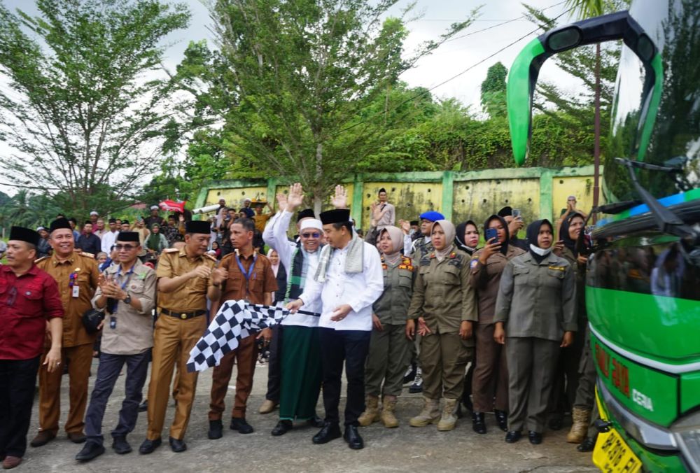 Merangin-Penjabat (Pj) Bupati Merangin, H. Mukti didampingi Sekda Merangin, Fajarman, memberangkatkan sebanyak 168 orang Calon Jemaah Haji (CJH) Merangin dan satu orang pendamping, yang tergabung dalam kloter 24, Selasa (04/6/24).