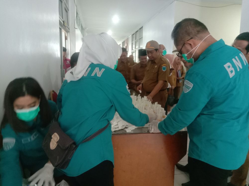 MUARABULIAN - Ratusan pejabat eselon II dan III di lingkungan Pemerintah Kabupaten Batanghari jalani tes urine yang dilakukan Badan Narkotika Nasional Kabupaten (BNNK) Batanghari, Senin (10/6/2024).
