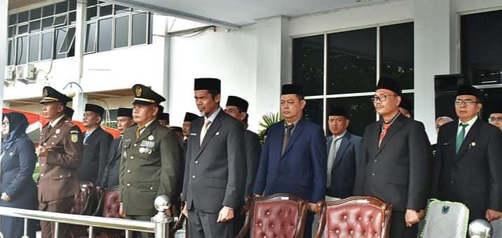 MUARABULIAN - Sekretaris Daerah Kabupaten Batanghari, Muhamad Azan, SH mengikuti Upacara dalam rangka memperingati Hari Bhayangkara Ke-78 tahun 2024 dihalaman Kantor Bupati Kabupaten Batanghari, Senin (1/7/2024).
