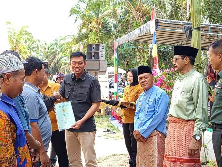 BAJUBANG - Bupati Batanghari, Muhammad Fadhil Arief, SE menyerahkan Sertifikat Redistribusi Tanah kepada masyarakat di wilayah Kecamatan Bajubang, Kabupaten Batanghari.