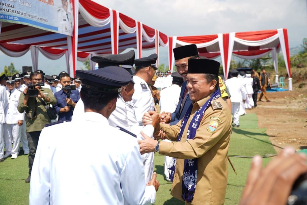 Bukit Tengah - Gubernur Jambi Dr. H. Al Haris, S.Sos, MH menghadiri dan menyaksikan Pengukuhan Perpanjangan 2 tahun masa jabatan Kepala Desa se-Kabupaten Kerinci oleh Pj. Bupati Kerinci, Asraf. Pengukuhan masa perpanjangan 285 Kades menjadi 8 tahun ini berlangsung di Depan Kantor Bupati Kerinci, Bukit Tengah, Siulak Mukai, Kabupaten Kerinci, Senin (15/07/2024).