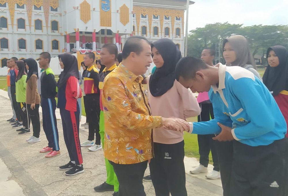 MERANGIN - Penjabat (Pj) Bupati Merangin, H. Mukti, memberi motivasi dan semangat kepadap petugas Pasukan Pengibar Bendera Pusaka (Paskibraka) Kabupaten0 Merangin 2024, di halaman depan kantor bupati Merangin, Kamis (08/8/24). H Mukti saat menyalami para anggota Paskibraka Merangin yang tengah istirahat berlatih tersebut, sangat bersyukur kepada Allah SWT karena semua anak-anak Paskibraka Merangin 2024 itu dalam keadaan sehat semua. ‘’Saya yakin dan percaya, anak-anak terpilih ini akan sukses dalam menjalankan tugasnya pengibarkan dan menurunkan dublikat bendara pusaka Merah Putih pada HUT RI ke-79 di Kabupaten Merangin,’’ ujar Pj Bupati. Dikatakan H Mukti, pada Selasa (06/8) beliau bersama bupati/walikota se-Indonesia diberi duplikat bendara pusaka Merah Putih dari Kepala Badan Pembinaan Ideologi Pancasila (BPIP) Yudian Wahyudi, di Balai Samudra Kelapa Gading Jakarta. Duplikat Bendera Bendera Pusaka Merah Putih itu menurut Pj bupati, selanjutnya akan dikibarkan pada peringatan Hari Ulang Tahun (HUT) Republik Indonesia ke-79, di halaman kantor bupati Merangin pada 17 Agustus 2024. ‘’Saya juga diberi duplikat teks Proklamasi Kemerdekaan Republik Indonesia yang ditulis tangan oleh Pak Presiden Republik Indonesia Pak Soekarno. Untuk itu anak-anak harus semangat terus,’’ pinta H Mukti. Diakui Pj bupati, tidak mudah bisa terpilih menjadi anggota Paskibraka, sebab melalui proses seleksi yang sangat ketat. Semua memakai standar, baik tinggi badannya, kemudian berat badannya dan terpenting harus sehat jasmani dan rohaninya ‘’Mudahan-mudahan lelalui Paskibraka ini saya berharap kedepan apa yang dicita-citakan anak-anak ini akan diberi kemudahan oleh Allah SWT,’’ harap Pj Bupati sembari menepuk pundak salah seorang anggota Paskibraka Merangin 2024. H Mukti pesan kepada para pelatih yang sedang menjalankan tugasnya, agat tidak terlalu memforsil habis-habisan anak-anak saat berlatih. Tapi tentunya para pelatih yang lebih tahu kondisi fisik anak-anak didiknya. ‘’Anak-anak gunakan waktunya dengan baik, kurangi waktu main android dan ketika jadwal istirahat gunakan waktu itu untuk istirahat, sehingga waktu istrirahatnya cukup. Begitu juga dengan makan dan minum serta tidurnya harus cukup,’’ pinta Pj Bupati lagi.