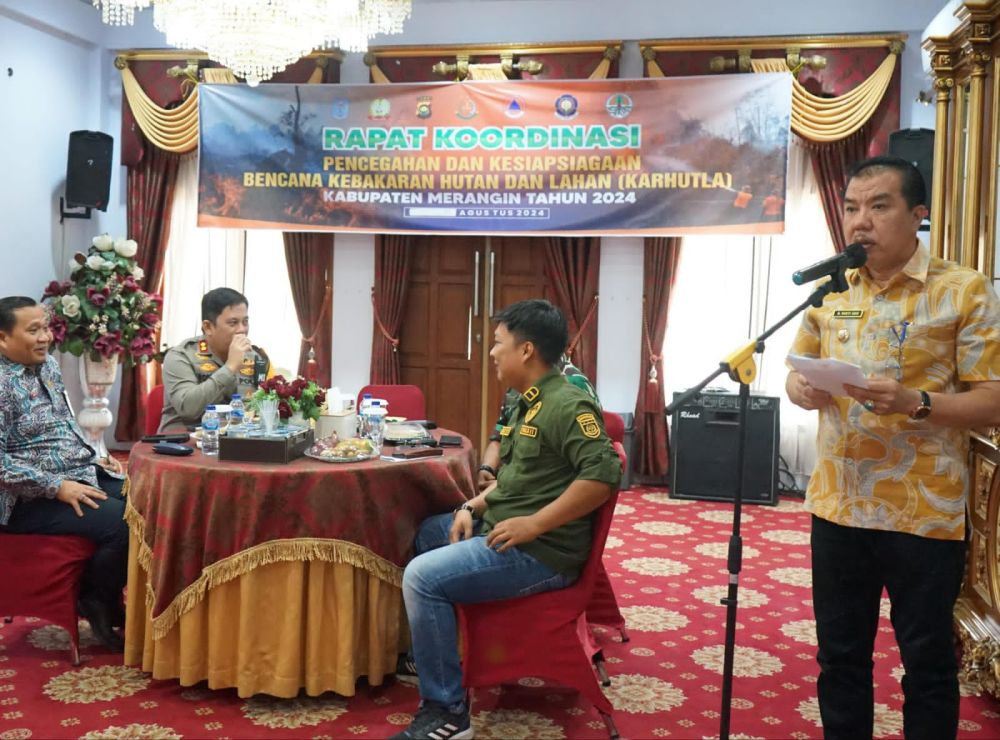 Ini menyusul terdeteksinya sebanyak 103 titik api (hostspot) yang ada di Kabupaten Merangin, dalam sepekan terakhir. Kondisi itu menempatkan Kabupaten Merangin diurutan ke-4 terbanyak titik api di Provinsi Jambi. Hal tersebut sebagaimana dikatakan Pj Bupati Merangin H Mukti, usai memimpin jalannya rakor tim pembina dan koordinasi penanggulangan bencana Karhutla 2024, di Ruang tengah rumah dinas bupati Merangin, Jumat (09/8/24). ‘’Jadi hasil rakor ini akan kami lanjutkan dengan Apel Gabungan deteksi dan pencegahan dini Karhutla yang akan digelar di halaman kantor bupati Merangin. Ini merupakan program nasional, provinsi dan kabupaten,’’ ujar Pj Bupati. Hasil rakor jelas Pj bupati, nantinya akan disosialisasikan ke masyarakat, agar masyarakat dapat saling menjaga, jangan sampai terjadi kebakaran rumah, hutan dan lahan di daerahnya masing-masing. Pada rakor itu, H Mukti menghimbau agar Perusahaan-perusahaan yang ada di Kabupaten Merangin, untuk menjaga betul jangan sampai terjadi kebakaran. ‘’Kami berharap perusahaan-perusahaan mempunyai alat pencegahan terjadinya Karhutla,’’ harap Pj Bupati. Tampak hadir pada rakor yang berlangsung serius dan khusuk itu, Forkopimda Merangin, para kepala Organisasi Perangkat Daerah di jajaran Pemkab Merangin, para Camat dan para Kapolsek se-Kabupaten Merangin.