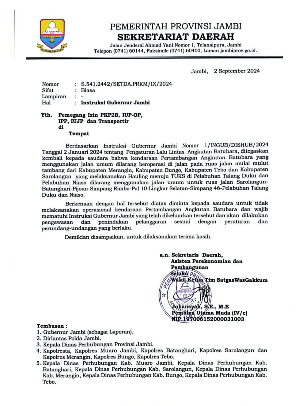 Surat yang ditandatangani Sekda Provinsi Jambi Sudirman yang diwakili Asisten II Setda Provinsi Jambi Johansyah itu menerangkan, penegasan kepada para pihak bahwasanya kendaraan Pertambangan Angkutan Batubara yang menggunakan jalan umum dilarang beroperasi di jalan pada ruas jalan yang telah ditentukan sebelumnya.