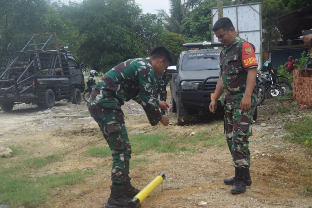 MERANGIN - TMMD (TNI Manunggal Membangun Desa) ke 122 Kodim 0420 Sarko yang dilaksanakan di desa Bedeng Rejo kecamatan Bangko Barat kabupaten Merangin. Salah satu kegiatan sasarannya yakni pembuatan sumur bor. Satgas TMMD ke 122 Kodim Sarko ini direncanakan akan membangun 5 titik sumur bor, 2 titik sumur bor di desa Sungai Putih, dan 3 titik berada di desa Bedeng Rejo. Hari ini anggota satgas TMMD menggunakan peralatan canggih dengan menurunkan water detector untuk mencari sumber air dalam tanah. Sertu Afdai anggota Satgas TMMD ke 122 Kodim 0420 Sarko mengatakan jika saat ini 1 titik sumur bor di desa Bedeng Rejo tepatnya di masjid Baitussalam akan dimulai pengeboran. "Ya sebelum pengeboran kita lakukan pengecekan sumber air tanah dengan menggunakan peralatan water detector. Setelah ketemu titiknya baru kita lakukan pengeboran"jelas Afdai Kamis (10/10/2024). Lebih lanjut dia mengatakan jika saat ini untuk progres pengerjaan sumur bor di desa Bedeng Rejo direncanakan tiga titik. "Rencananya tiga titik, nanti semua kita cek menggunakan water detector," pungkasnya.