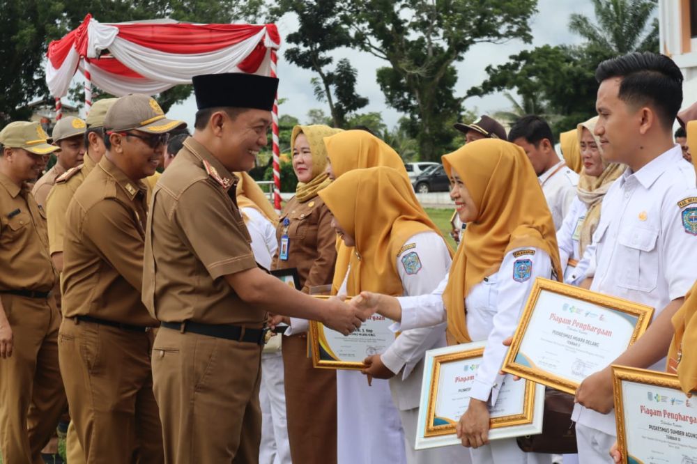 MERANGIN - Sebanyak 49 penghargaan dari berbagai jenis kegiatan diberikan Dinas Kesehatan Merangin, pada puncak peringatan Hari Kesehatan Nasional ke-60 di halaman kantor bupati Merangin, Senin (02/12). Penghargan tersebut secara simbolis diberikan Pj Bupati Merangin Jangcik Mohza, melalui Sekda Merangin Fajarman usai upacara peringatan HKN ke-60 yang diikuti seluruh pegawai Puskesmas-puskesmas dan ribuan ASN Pemkab Merangin. Tampil sebagai Inspektur upacara peringatan HKN ke-60 itu, Sekda Merangin Fajarman. Dalam pengarahannya Sekda membacakan sambutan Menteri Kesehatan Republik Indonesia Budi Gunadi Sadikin. ‘’Peringatan HKN ke-60 kali ini mengambil tema ‘’Gerak Bersama, Sehat Bersama’’. Hal ini mutlak harus menjadi semangat kita semua,’’ujar Fajarman pada upacara yang dihadiri unsur Forkopimda, pejabat eselon II dan III di jajaran Pemkab Merangin. Transformasi kesehatan lanjut Fajarman, adalah tonggak penting dalam sejarah perjalanan bangsa lndonesia, menuju bangsa yang maju. Langkah perubahan yang sudah dilakukan menjadi dasar kuat percepatan program kesehatan ke depan. ‘’Sebagai program prioritas Kabinet lVlerah Putih, Bapak Presiden memberi penekanan di 3 (tiga) area program kesehatan, yaitu. pertama pemeriksaan kesehatan gratis, kedua penurunan kasus TB, dan ketiga pembangunan RS lengkap berkualitas di daerah terpencil dan tertinggal,’’ jelas Sekda Merangin. Pada kesempatan ini, Sekda berpesan kepada seluruh jalaran kesehatan untuk berkontribusi maksimal terhadap kesuksesan pencapaian program Pemerintah. Sekda memberikan penghargaan setinggi-tingginya, kepada seluruh insan kesehatan yang telah bahu membahu berjuang tanpa lelah dalam melaksanakan pembangunan kesehatan lndonesia. Lebih lanjut dikatakan Fajarman, tenaga medis, tenaga kesehatan, LSNI, swasta, media, profesional, akademisi, seluruh pegawai dan pejabat Pemerintahan di Pusat dan Daerah, serta para kader, terima kasih. ‘’Terus semangat, sebab perjuangan kita belum selesai. Tak lupa, saya ajak seluruh masyarakat untuk terus mengutamakan kesehatan, mulai dari diri sendiri, keluarga dan lingkungan sekitar kita. Mari kita bangun bersama budaya sehat, demi lndonesia Emas 2045, bahkan sampai ke generasi selanjutnya,’’ pinta Sekda Merangin. Peringatan Hari Kesehatan Nasional ke-60 di Kabupaten Merangin itu, diakhiri dengan Penyaluran bantuan sosial Percepatan Penghapusan Kemiskinan ekstrem (P3KE) secara simbolis kepada 10 orang dari sebanyak 140 orang yang akan diberikan.