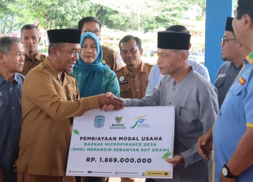 Merangin-Masih dirangkaian kegiatan Hari Ulang Tahun (HUT) ke-75 Kabupaten Merangin, Pj bupati Jangcik Mohza menyalurkan bantuan program Merangin Perduli dari Baznas Kabupaten Merangin. Bantuan pembiayaan modal usaha untuk sebanyak 607 orang pelaku Usaha Makro Kecil Menangah (UMKM) dan sebanyak 261 orang petugas kebersihan itu, dilakukan di pelataran rumah dinas bupati Merangin, Selasa (24/12/24). ‘’Alhandulillah di hari baik nan elok pada HUT ke-75 Kabupaten Merangin ini, kita salurkan bantuan program Merangin Perduli dari Baznas Merangin,’’ujar Pj Bupati didampingi Ketua Baznas Merangin H Syafrudin Hadi. Untuk bantuan modal usaha lanjut Pj bupati, diberikan kepada para pelaku UMKM sebanyak 607 orang itu masing-masing mendapatkan bantuan sebesar antara Rp 3 juta hingga Rp 5 juta. Sedangkan program Merangin Perdulu untuk Petugas Kebersihan disalurkan kepada sabanyak 261 orang, masing-masing orang mendapatkan bantuan sebesar Rp 200 ribu. ‘’Petugas kebersihan itu baik yang bertugas di rumah dinas bupati Merangin, rumah dinas Sekda di kantor-kantor maupun yang bertugas membersihkan jalan-jalan dalam Kota Bangko,’’terang Jangcik Mohza. Pada kesempatan itu Pj bupati mengajak seluruh masyarakat Kabupaten Merangin untuk membayar zakat, infak, sedekah atau bentuk apapun melalui lembaga yang ada di Kabupaten Merangin yaitu Baznas. ‘’Ini bukan berarti melarang menyalurkannya di tempat-tempat yang lain itu tidak, tapi kita berharap terhimpun agar pendistribusian yang dilakukan terhadap rizki yang diberikan Allah kepada kita itu, benar-benar dinikmati dan dirasakan oleh masyarakat banyak sesuai dengan peraturan perundang-undangan,’’jelas Pj Bupati. Tampak hadir turut menyalurkan bantuan itu, Ketua TP PKK Merangin Ny Suflini Jangcik Mohza dan para kepala Organisasi Perangkat Daerah (OPD) di jajaran Pemkab Merangin.