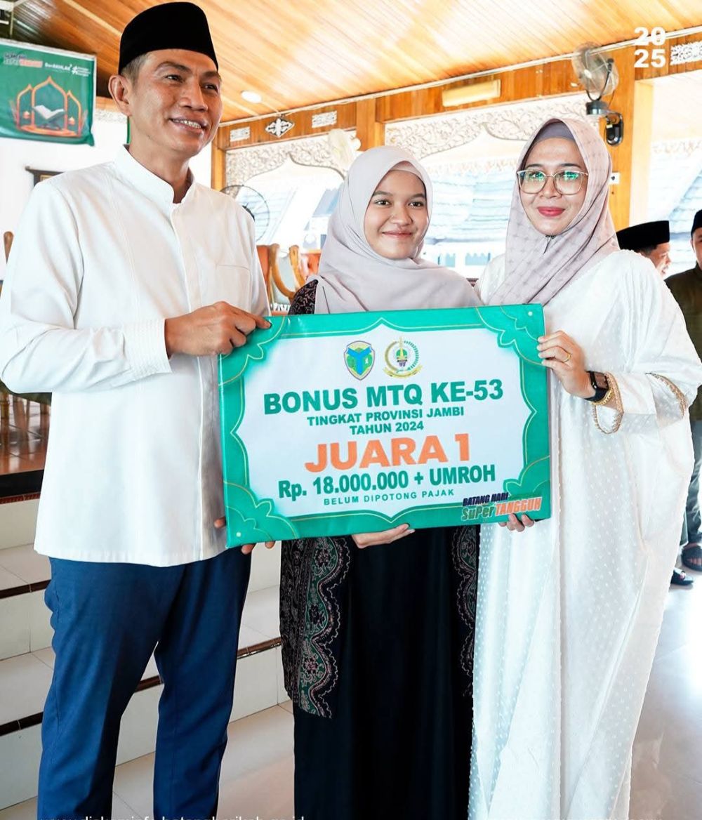 MUARABULIAN - Dalam rangka menyambut Nuzul Qur'an, Bupati Batanghari Muhammad Fadhil Arief, SE dan Wakil Bupati Batanghari, H. Bakhtiar, SP secara langsung menyerahkan bonus MTQ dan pemberian hadiah pemenang FASI.