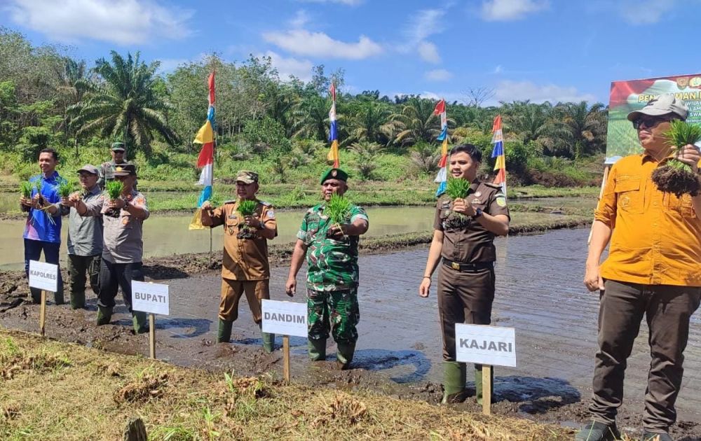 Merangin - Wabup Merangin, H. A Khafid Moein melakukan tanam padi serentak di lokasi penanaman padi serentak seluruh wilayah Provinsi Jambi, yang perdana di Desa Tambang Emas, Kecamatan Pamenang Selatan, Kabupaten Merangin, Selasa (22/4). Penanaman padi serentak tersebut, dalam rangka mendukung program swasembada pangan nasional. ‘’Jadi untuk di Desa Tambang Emas ini ada sebanyak 15 hektar lahan yang siap tanam padi sawah,’’ ujar Wabup. Untuk satu tahun lahan tambah tanam di Kabupaten Merangin jelas wabup, ditargetkan sebanyak 13 ribu hektar. Sedangkan untuk Bulan April 2025 ini ditargetkan tanam padi sawah seluas 159 hektar. ‘’Insya Allah, target itu bisa tercapai dengan kebersamaan seluruh stokeholder Merangin, Dandim 0420/Sarko, Polres Merangin, Dinas Tanaman Pangan dan Holtikultura Merangin serta para petani,’’ harap Wabup. H A Khafid Moein menghimbau kepada para petani di Kabupaten Merangin, untuk terus berupaya meningkatkan sistem pola tanam, yang saat ini sudah berjalan satu tahun tanam dua kali panen. ‘’Mundah-mudahan dengan bimbingan dari Dinas Tanaman Pangan dan Holtikultura Merangin dan dinas terkait lainnya serta bantuan bibit dari Pusat bisa meningkatkan sisten pola tanam ini setahun bisa tiga kali panen,’’ pinta Wabup. Selain itu diterangkan wabup, bibit padi yang ditanam saat ini masih dari swasembada para petani di Kabupaten Merangin. Wabup berharap semoga bibit dari Pemerintah Pusat segera sampai ke Kabupaten Merangin. Pada kesempatan itu, wabup menyerahkan bantuan satu unit mesin pompa air dari Tim Peningkatan Ketahanan Pangan Kabupaten Merangin, Dandim 0420/Sarko, Polres Merangin serta Dinas Tanaman Pangan dan Holtikultura Merangin kepada ketua kelompok tani di kawasan tersebut. Sebelum melakukan tanam padi serentak dilakukan Rakor bersama Wakil Gubernur (Wagub) Jambi H Abdulah Sani secara zoom meeting. Pada rakor itu Wagub menanyakan langsung kesiapan dan kendala yang dihadapi pada tanam padi serentak itu. Tampak hadir mendampingi wabup, Kasdim Mayor Inf Usman bersama jajarannya, perwakilan dari Polres Merangin, perwakilan dari Kejari Merangin, Kadis Tanaman Pangan dan Holtikultura Merangin Zainal Abidin, Kadis Kominfo M Arief, Kadis PMD Andrei dan para pejabat lainnya, serta tiga orang anggota DPRD Merangin perwakilan dapil III Pamenang.