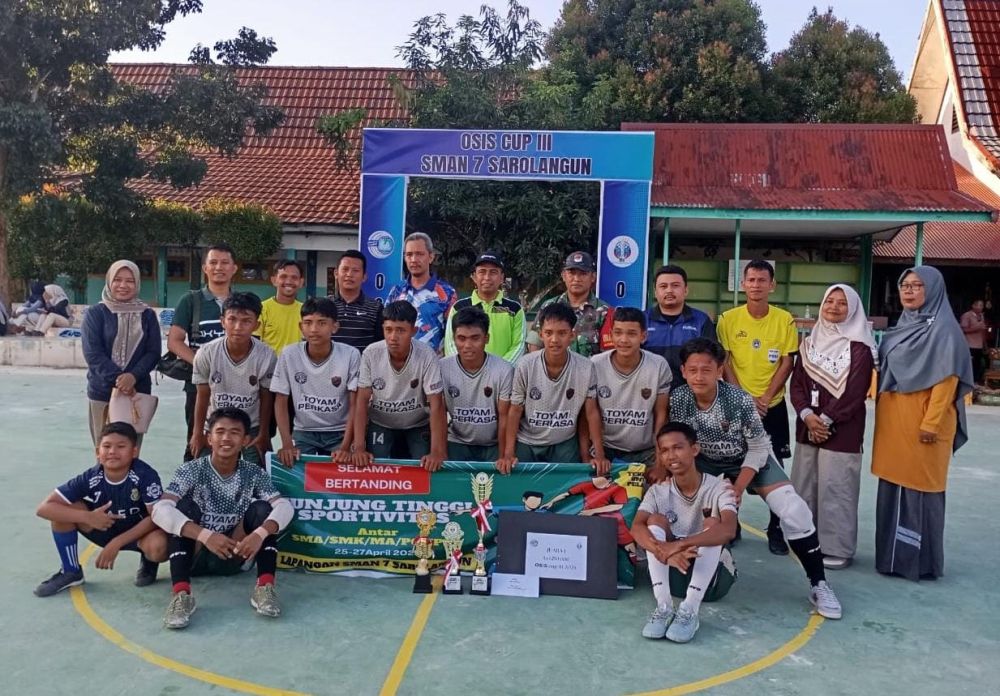 Sarolangun, Senin 28 April 2025 - Babinsa Koramil 420-04/Sarolangun, Kodim 0420/Sarko menghadiri acara Peutupan Turnamen Futsal OSIS CUP III SMAN 7 Sarolangun yang digelar di Lapangan Futsal SMA N 7 Sarolangun Kelurahan Sarolangun Kembang, Kecamatan Sarolangun, Kabupaten Sarolangun. Adapun maksud dari kegiatan ini diselenggarakan bertujuan untuk menjalin hubungan antar Siswa SeKabupaten Sarolangun yang sekaligus mencari siswa yang berbakat dan berkualifikasi pemain yang handal untuk mengukuti even-even pada tingkat yang lebih tinggi. Kegiatan ini Di ikuti Oleh 22 tim dan sekaligus sebagai penyaluran bakat anak remaja, kegiatan ini juga untuk mencari calon-calon atlet Sepak Bola dan Futsal yang ada di Kabupaten Sarolangun dengan harapan bisa sampai ke tingkat Provinsi Bahkan Nasional. Babinsa megucapkan terimakasih kepada pemain dan penonton karena telah mengutamakan sportifitas dalam pertandingan dan mudah-mudahan juga akan melahirkan talenta pesepak bola yang bisa mengharumkan nama Daerah untuk di tingkat lokal, maupun sampai dengan ke tingkat nasional. "Kegiatan ini diharapkan menjadi wadah untuk kembali menunjukan dan menghidupkan potensi-potensi pemuda yang ada di Kabupaten Sarolangun, sekaligus turnamen ini menjadi ajang pencarian calon atlit muda khususnya olahraga futsal,” ujar Babinsa.