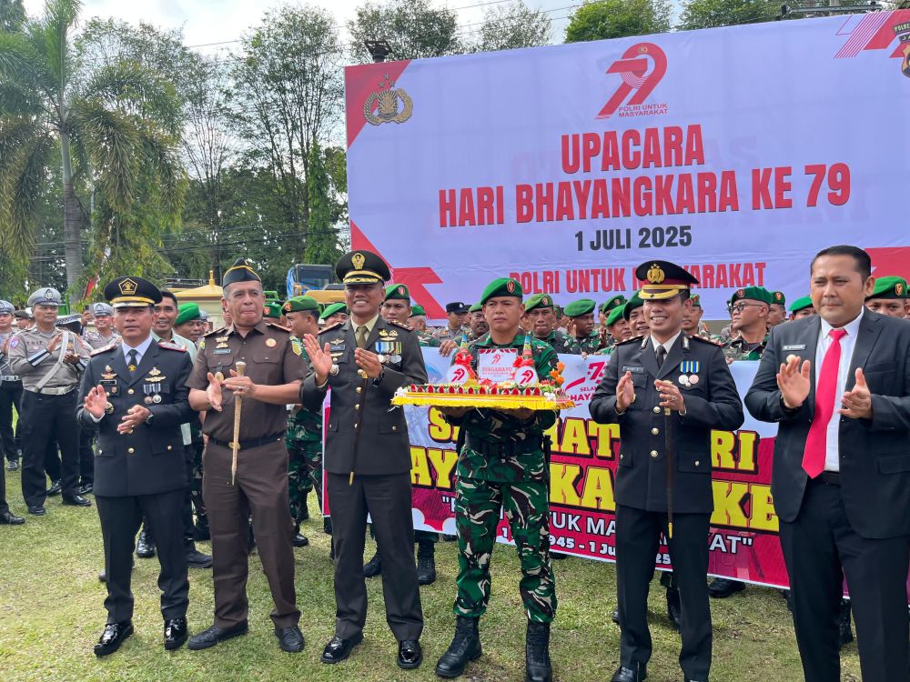 MERANGIN — Dalam semangat sinergitas TNI-Polri yang semakin solid, Dandim 0420/Sarko, Letkol Inf Suyono, S.Sos., bersama seluruh Perwira Staf dan para Danramil jajaran Kodim 0420/Sarko, menghadiri upacara peringatan Hari Ulang Tahun (HUT) Bhayangkara ke-79 yang digelar di halaman Mapolres Merangin, Selasa (1/7/2025).