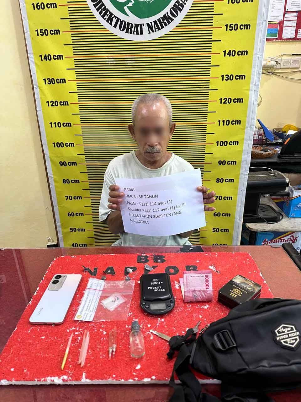 MERANGIN - Jambi. Usia uzur yang seharusnya fokus mengisi hari-hari tua dengan beribadah, namun hal berbeda dilakukan oleh tersangka S (58), yang merupakan warga Desa Bukit Subur Kec.Tabir Timur Kab. Merangin. Kakek yang sudah dikaruniai 3 cucu ini justru terlibat sindikat narkoba. Tim Opsnal Sat Resnarkoba Polres Merangin berhasil menangkap tersangka pada hari Kamis (03/07/2023) sekira pukul 18.30 Wib, dijalan Desa saat Tersangka hendak menggunakan narkotika jenis sabu. “Memang awalnya kita mendapat informasi dari masyarakat, bahwa dijalan lopon balok (lokasi keluarnya kayu) yang berada di Desa Bukit Subur Kec.Tabir Timur, sering dijadikan tempat transkasi dan pesta narkotika jenis sabu,” ungkap Kasat Resnarkoba Polres Merangin, AKP REZI Darwis, SH.,M.M pada Senin (07/07/2025). Laporan ini kemudian ditindak lanjuti dengan melakukan serangkaian kegiatan penyelidikan, hingga kemudian tersangka berhasil diamankan. ”Benar, tersangka S kita tangkap pada saat melintas dijalan lopon kayu Desa Bukit Subur, dan pada saat dilakukan penggeledahan kami temukan barang bukti berupa paket narkotika jenis sabu didalam Tas yang disimpan didalam jok sepeda motor tersangka, selanjutnya tersangka dan barang bukti kita amankan ke Polres Merangin”, jelas Rezi. Dari penangkapan tersangka S, turut disita barang bukti berupa 2 (dua) buah plastik klip bening yang berisikan berisikan narkotika jenis sabu berat bersih 1,302 gram, 1 (satu) unit hp android merek VIVO warna silver, 1 (satu) unit sepeda motor merek Honda Revo warna hitam, 3 (tiga) buah alat sendok takar yang terbuat dari sedotan plastik, 2 (dua) buah pirex kaca, 1 (satu) buah alat hisap sabu/bong, 1 (satu) buah alat timbangan digital dengan merek CHQ warna hitam, 1 (satu) buah tas selempang warna hitam dengan merek Hyper Rider, uang tunai senilai Rp.700.000,- (tujuh ratus ribu rupiah) dan 1 (satu) buah kotak rokok Dji Sam Soe warna hitam. Kasubsi Penmas Polres Merangin AIPTU Ruly.S.Sy.,M.H, saat ditemui awak media menyampaikan bahwa tersangka S, yang diamankan pada saat itu berperan sebagai kurir sekaligus pengguna narkotika jenis sabu. “Dari hasil pemeriksaan sementara, bahwa tersangka mengaku berperan sebagai kurir narkotika jenis sabu kurang lebih 6 bulan, yang mana barang haram tersebut didapat dari rekannya yang identitasnya sudah diketahui dan saat ini masih dilakukan pendalaman, sedangkan keuntungan yang didapat oleh tersangka selama menjadi kurir sabu, yakni dapat menggunakan narkotika sabu secara gratis serta mendapatkan tambahan uang rokok”, sebut Ruly. Guna mempertanggung jawabkan perbuatannya terhadap tersangka dikenakan Pasal 114 (1) subsideir pasal 112 (1) Undang-undang RI nomor 35 tahun 2009 tentang Narkotika, dengan ancaman paling singkat 5 tahun penjara.Penulis: Doni Sobri