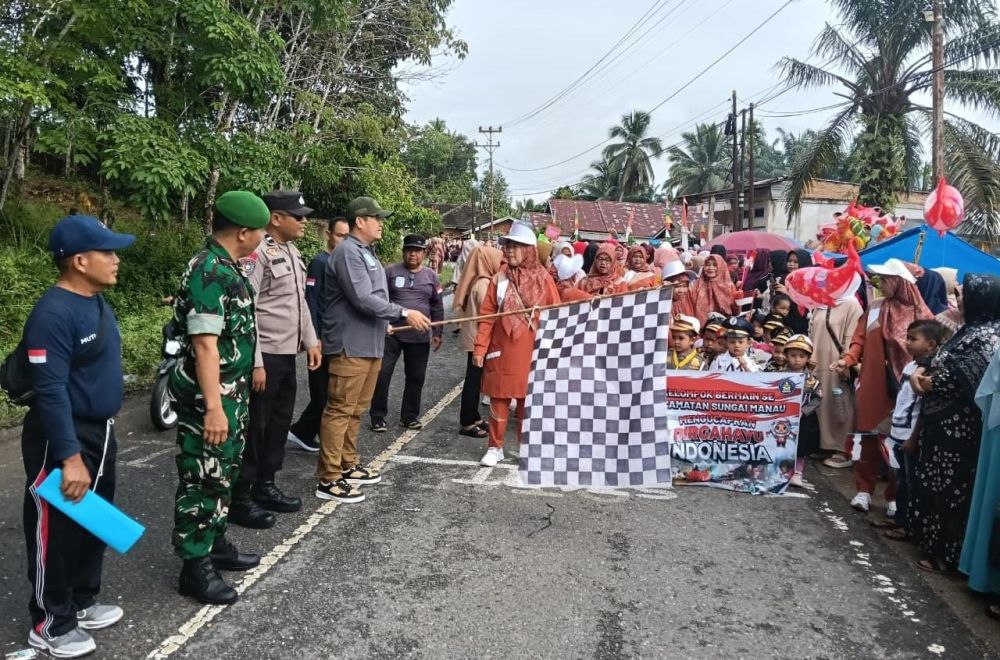 Danramil 420-07/Sei Manau, Lettu Cba Syafrianto, yang diwakili oleh Babinsa Serka Ependes Suandi, bersama Bhabinkamtibmas Polsek Sei Manau, tampak mendampingi Camat Sungai Manau dalam menyambut dan membuka acara pawai.
