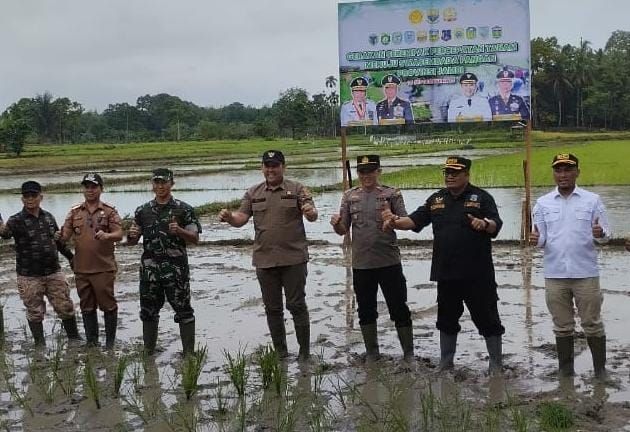Bangko - Bupati Merangin, H. M Syukur bersama Dandim 0420/Sarko Letkol Inf Yakhya Wisnu Arianto, Kapolres AKBP Kiki Firmansyah diwakili Kapolsek Tabir, Kajari Bintang diwakili Kasi Datun Buchori, Wakil Ketua DPRD Herman Effendi dan Ahmad Fahmi, tanam padi sawah serentak, Selasa (16/9). Gerakan serempak diseluruh Indonesia percepatan tanam menuju swasembada pangan tersebut, diawali zoom meeting untuk kabupaten/kota se-Provinsi Jambi dipusatkan di Kabupaten Batanghari. Sedangkan di Kabupaten Merangin tanam padi serentak yang mendapat dukungan penuh dari bupati dan unsur Forkopimda dan berbagai pihak tersebut, secara simbolis dipusatkan di persawahan Desa Seling Kecamatan Tabir. ‘’Di Tabir ada 893 hektar sawah. Kita berterimakasih kepada TNI dan semua yang terlibat. Program ini singkron dengan visi misi kita. Jadi tidak dihulunya saja, kita jalankan program Asta Cita Pak Presiden Prabowo ini hingga ke hilir,’’ujar Bupati. Pemkab Merangin lanjut bupati, akan membangun pabrik Beras Modern. Selama ini, masyarakat hanya berfikir sawah hanya untuk makan, sehingga banyak alih fungsi sawah jadi kebun sawit, padahal bila sawah digarap hasilnya lebih banyak dari sawit. Dijelaskan bupati, di Kabupaten Merangin ada seluas 5.200 hektar sawah, padahal bupati mencatat ada 6.000 hektar. Untuk satu hektar sawah menghasilkan enam ton gabah. Jadi dalam setahun dua kali tanam itu lanjut bupati, Merangin bisa menghasilkan 72.000 ton gabah. ‘’Artinya Merangin tidak hanya swasembada panan, tapi sudah surflus beras dan ini bisa menjadi potensi yang luar biasa,’’terang Bupati. Bupati berharap tidak ada lagi warga yang alih fungsi sawah jadi kebun sawit. Pemerintah akan membantu semaksimal mungkin bagi warga yang memanfaatkan sawahnya dengan baik untuk menanam padi sawah. ‘’Nanti kualitas bibit dan pupuknya kita tingkatkan lagi, begitu juga dengan penyuluhan pertanian lebih sering dilakukan, sehingga pada musim panen nanti gabah yang dihasilkan juga akan lebih meningkat,’’terang Bupati. Intinya tegas bupati, di Kabupaten Merangin semua unsur Forkopimda dan organisasi yang terlibat mendukung sepenuhnya program Asta Cita Presiden Prabowo, untuk meningkatkan ketahanan pangan. Dandim 0420/Sarko Letkol Inf Yakhya Wisnu Arianto berterimakasih kepada bupati dan semua pihak yang telah bahu-membahu dalam mensukseskan program ketahanan pangan yang telah digagas Presiden Prabowo. ‘’Mari kita wujudkan swasembada pangan, bahkan suflus kata Pak Bupati tadi. Kita yakin Indonesia bisa hidup dengan berasnya sendiri. Semoga program ini dapat berjalan baik dan berkesinambungan sebagaimana yang diharapkan,’’ujar Dandim 0420/Sarko. Tanpak hadir pada tanam padi serentak itu, Plt Kadis Kominfo Akhmad Khoirudin (Akhoi), Plt Kadis Nakbun Daryanto, Kepala Bulog Merangin Hamdani, Kadis Perindag Andei, Kadis PMD Dedi Candra, Plt Kadis Tanaman Pangan dan Holtikultura Mujiburrahman dan pejabat lainnya.Penulis: Doni Sobri