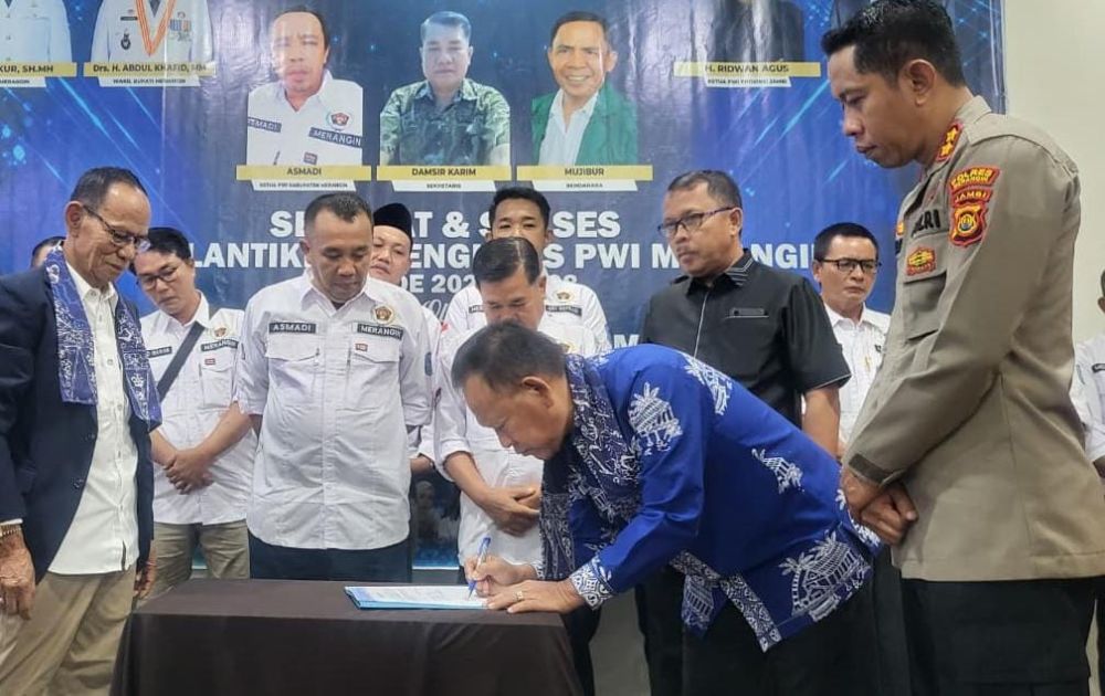 Bangko-Bupati Merangin H M Syukur melalui Wabup Merangin H A Khafidh, mengajak Persatuan Wartawan Indonesia (PWI), untuk bersinergi membangun Kabupaten Merangin yang sama-sama dicintai. Ajakan tersebut disampaikan wabup secara tegas pada sambutan acara pelantikan para pengurus PWI Kabupaten Merangin periode 2025-2028 oleh Ketua PWI Jambi H Ridwan Agus, di Auditorium Hotel Family Iin Bangko, Kamis (16/10). ‘’Mestinya Pak Bupati tadi yang akan hadir di acara yang spektakuler ini, tapi karena beliau ada kegiatan yang tidak bisa diwakilkan, makanya saya yang hadir. Selamat kepada para pengurus PWI Merangin yang baru dilantik,’’ujar Wabup. Selamat lanjut wabup kepada Asmadi sebagai ketua PWI Merangin, Damsir Karim sebagai Sekretaris, Mujiburrahman sebagai Bendahara dan para pengurus PWI Merangin lainnya yang baru dilantik. Melalui kebersamaan antara Pemkab Merangin dengan PWI Merangin yang seiring dan sejalan, wabup yakin kedepan Kabupaten Merangin akan jauh lebih baik lagi menuju Merangin Baru (Berdayasaing Akuntabel, Revormis dan Unggul). Wabup juga mengajak PWI Merangin melalui para wartawan-wartawan profesionalnya, untuk bersama mengedukasi berbagai program Pemerintah kepada masyarakat luas. ‘’Kementerian Pertanian saat ini sedang gencar melalukan program Hilirisasi Kopi, akan dibangun sebanyak 26 Pabrik Kopi di Indonesia, dua diantaranya berada di Provinsi Jambi dan kita harapkan satu saja bisa dibangun di Merangin,’’terang Wabup. Terpisah, Ketua PWI Jambi H Ridwan Agus mengucapkan terimakasih kepada Bupati Merangin H M Syukur melalui wabup, yang telah memberikan dukungan baik fisik maupun non fisik, guna terlaksanannya acara pelantikan PWI Kabupaten Merangin. ‘’Saya merasa sangat gembira karena pada kesempatan ini dapat bertemu wabup berserta pejabat di jajaran Pemkab Merangin. PWI sudah tentu mempunyai jiwa patriot dan cinta tanah air, termasuk Kabupaten Merangin,’’terang H Ridwan Agus. Sementara itu, Asmadi ketua PWI Merangin menegaskan siap bersinergi dengan Pemkab Merangin dan juga akan bersama-sama para pengurus dan anggota untuk membesarkan PWI di Kabupaten Merangin. Tampak hadir pada acara pelantikan ketua dan pengurus PWI Merangin tersebut, Kapolres Merangin AKBP Kiki Firmansyah, Anggota DPRD Provinsi Jambi Izhar Majid, Kepala Kemenag Merangin H Husaini, Staf Ahli Bupati Merangin Hendri Widodo. Hadir juga Komandan Satuan Batalyon B Pelopor Brimob Polda Jambi di Pamenang diwakili Pasi LOG AKP Haryanto Sitepu, Kaban Kesbangpol Mulyono, Sekretaris Dinas Kominfo Merangin Teguh J Jagat, Rusli dari Inspektorat Merangin dan undangan lainnya.Penulis: Doni Sobri