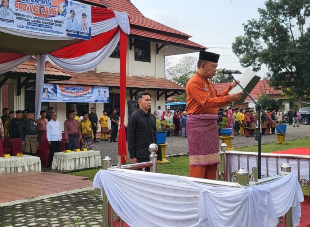 BANGKO – Wakil Bupati Merangin, A. Khafidh memimpin upacara peringatan Hari Ulang Tahun (HUT) ke-69 Provinsi Jambi yang digelar di halaman Kantor Dinas Komunikasi dan Informatika (Diskominfo) Kabupaten Merangin, Selasa (6/1). Upacara yang berlangsung khidmat tersebut dihadiri oleh unsur Forkopimda, Asisten I Sukoso, Asisten III Henizor, para Staf Ahli Bupati, serta seluruh Kepala Organisasi Perangkat Daerah (OPD) di lingkup Pemerintah Kabupaten Merangin dan seluruh Aparatur Sipil Negara (ASN), Pegawai Pemerintah dengan Perjanjian Kerja (PPPK) dan Paruh Waktu (PW) di lingkup Pemkab Merangin. Dalam rangkaian upacara, Wakil Ketua II DPRD Kabupaten Merangin, Herman Efendi, bertugas membacakan naskah Deklarasi Badan Kongres Rakyat Jambi. Sementara itu, personil Satpol PP Merangin bertindak sebagai pembawa bendera lambang Provinsi Jambi. Dalam kesempatan tersebut, Wabup A. Khafidh menyampaikan ucapan selamat atas hari jadi provinsi berjuluk Bumi Melayu tersebut. Ia berharap visi "Jambi Mantap" yang diusung Gubernur Jambi, H. Al Haris dapat terus terwujud. "Saya atas nama Pemerintah Kabupaten Merangin beserta jajaran mengucapkan Selamat Dirgahayu ke-69 Provinsi Jambi. Semoga Jambi menjadi 'Jambi Mantap' sesuai visi misi Bapak Gubernur," ujar Wabup. Beliau juga menambahkan bahwa sejauh ini progres pembangunan di Provinsi Jambi, khususnya yang berlokasi di wilayah Kabupaten Merangin, telah berjalan dengan lancar berkat sinergi yang kuat antar lini pemerintahan. Lebih lanjut, Wabup menekankan pentingnya persatuan antara pemerintah dan lapisan masyarakat untuk mendorong kemajuan daerah. "Kami menghimbau dan berharap kepada seluruh masyarakat Merangin untuk terus bersinergi, bersatu, dan menjaga silaturahmi. Mari kita bersama-sama membangun Kabupaten Merangin pada khususnya, dan Provinsi Jambi pada umumnya," pungkasnya.